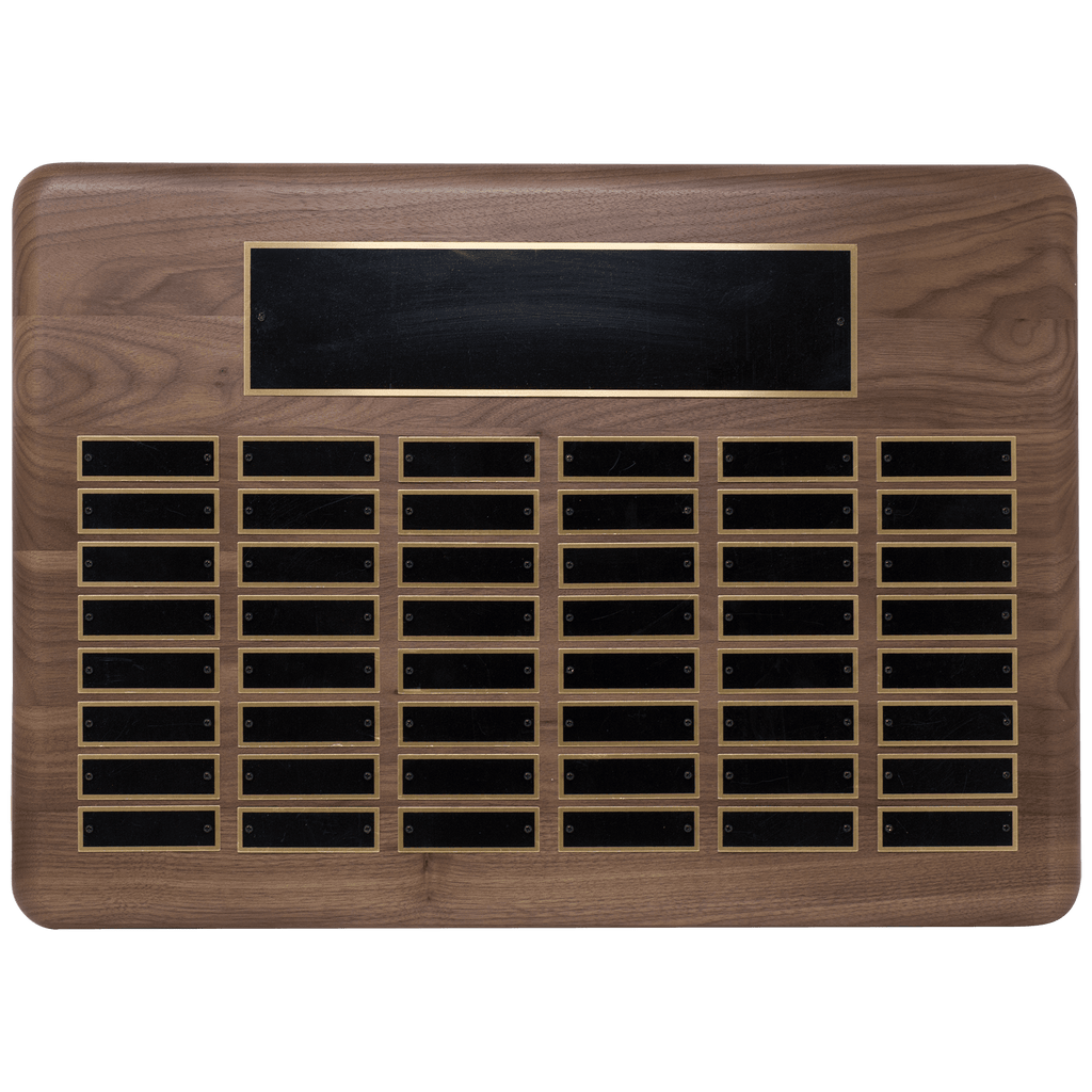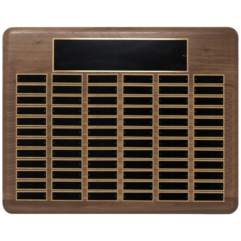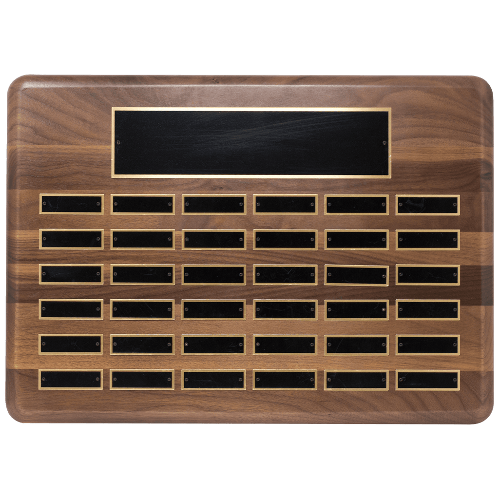 If you are looking for a classic plaque for your employees, or team members, look no further! This American walnut perpetual plaque is offered in several sizes to hold 12 to 144 black brass name plates.